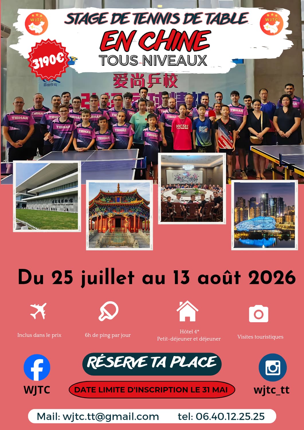 20 jours de stage avec des entraînements (6h/jour, 6j/7) au cœur du pays du ping-pong ![]()