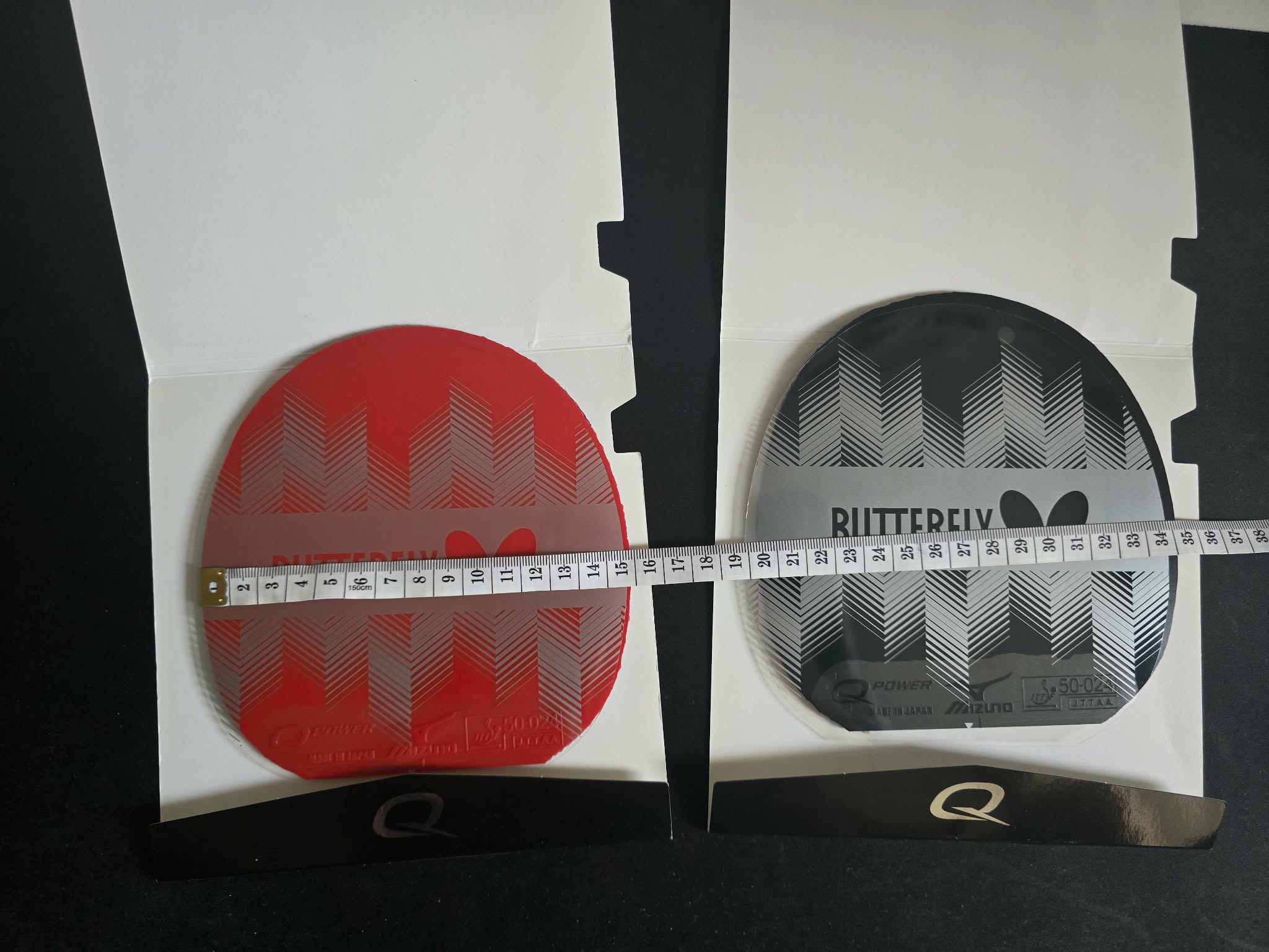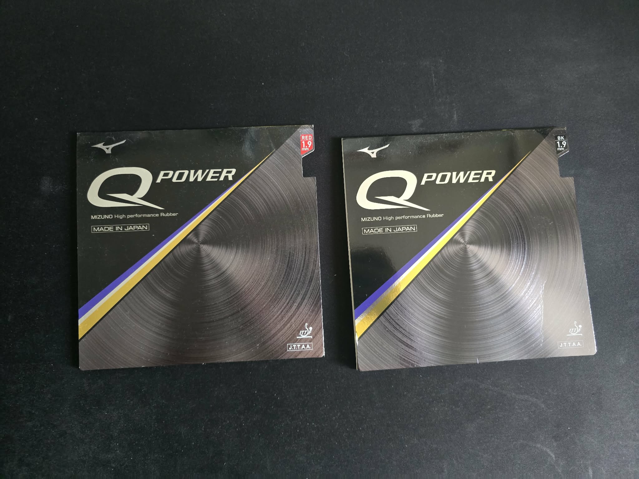Je vends deux revêtements de tennis de table Mizuno Q Power, x1 en rouge et x1 en noir, en épaisseur 1.9mm utilisés seulement 1 fois.